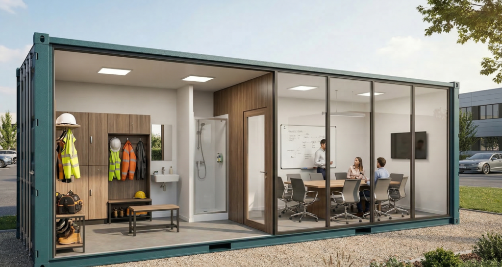 Cet aménagement combine des vestiaires techniques et une salle de réunion lumineuse, offrant une solution structurelle complète pour les équipes terrain et bureau.